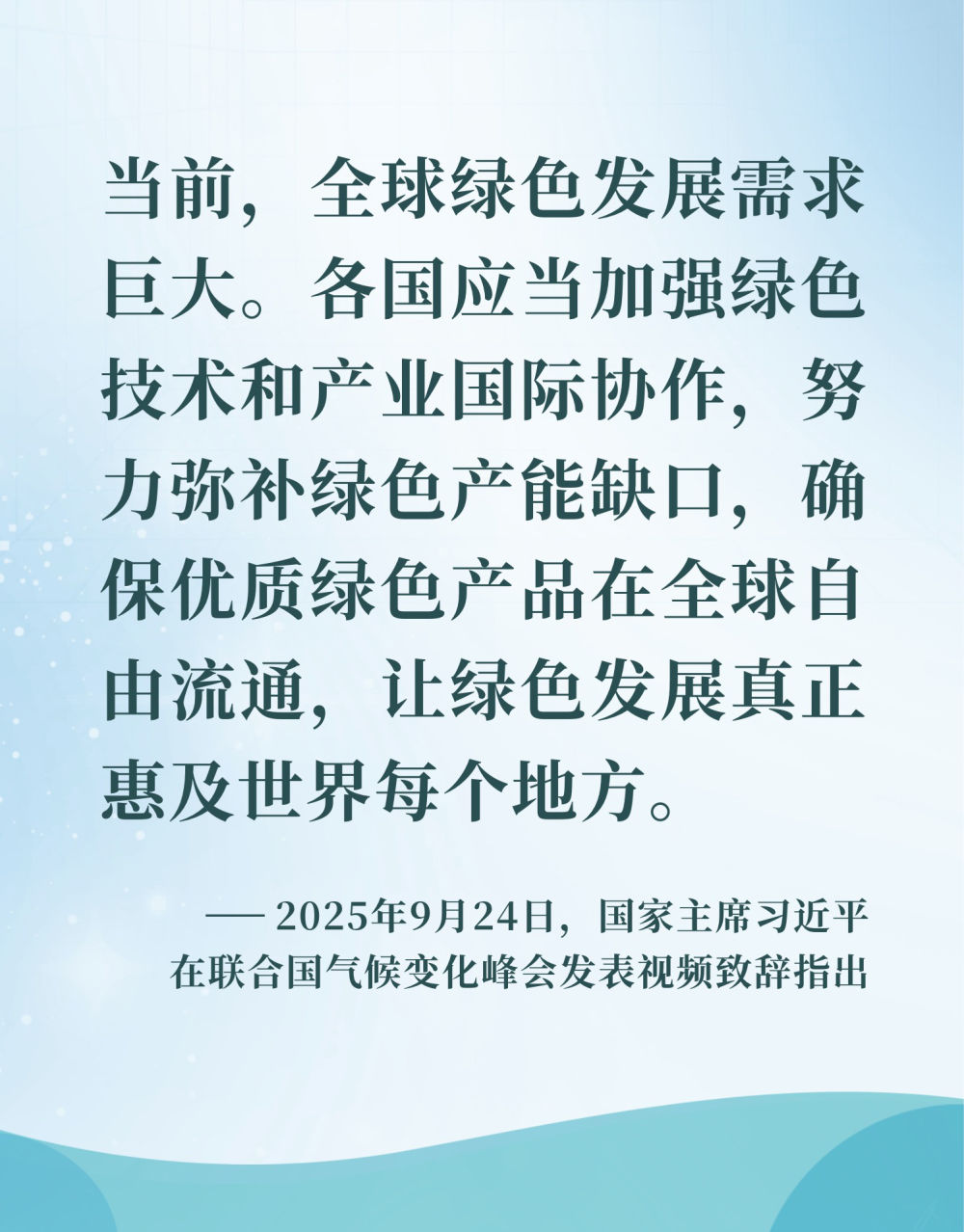 胸怀人类共同的前途命运,习近平主席多次呼吁加强绿色国际合作,共享绿色发展成果。