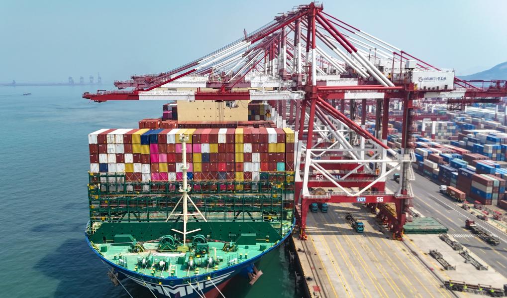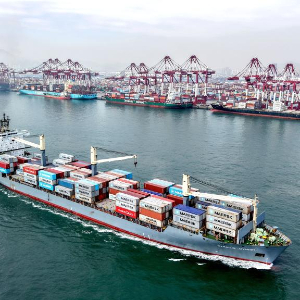 山东港口青岛港,装载外贸集装箱的货轮驶离港口。