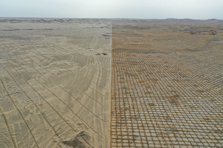 暮春时节,驱车行驶在宁夏中卫境内的腾格里沙漠东南缘,沙脊线上,治沙工人展开一捆捆刷状草绳纵横铺设,仿佛为沙丘披上“格子衫”。
