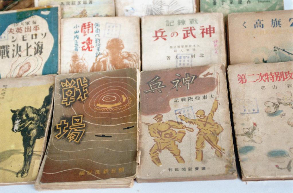 图为日本读卖新闻社、朝日新闻社当年出版的部分书籍,许多书名充斥着对侵华日军的美化。新华社记者陈天湖摄(传真照片)(1998年2月13日发)