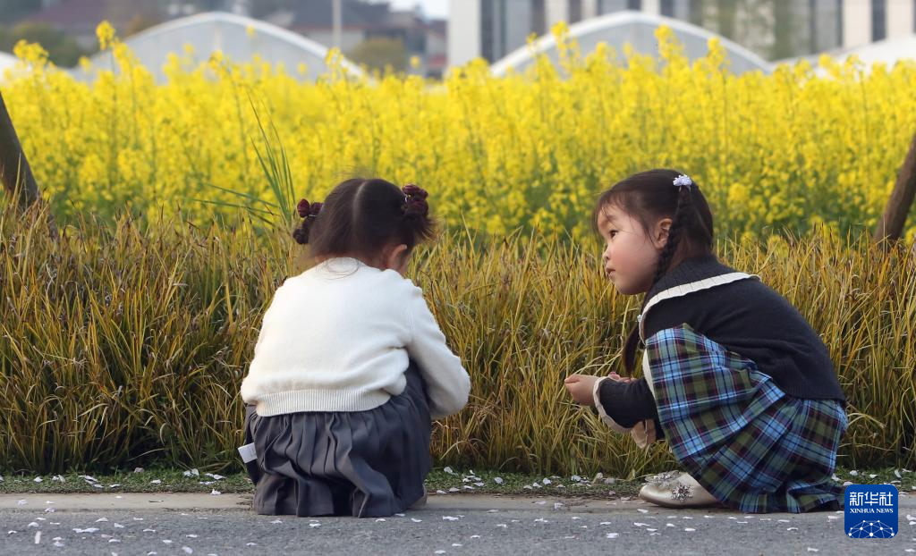 3月29日,儿童在浙江杭州“谢径安”农创村的油菜花田旁玩耍 。新华社记者 程丽 摄