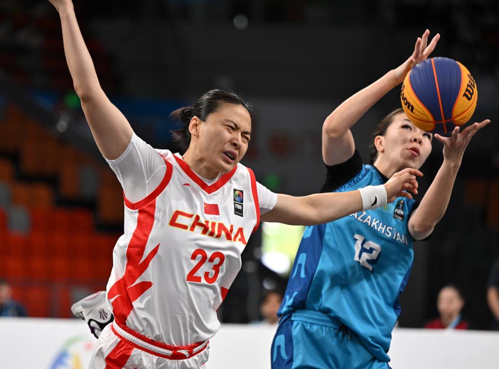 4月25日,中国队球员王丽丽(左)在比赛中拼抢。当日,在海南三亚举行的第六届亚洲沙滩运动会三人篮球女子小组赛,中国队22:8战胜哈萨克斯坦队。新华社记者 郭程 摄