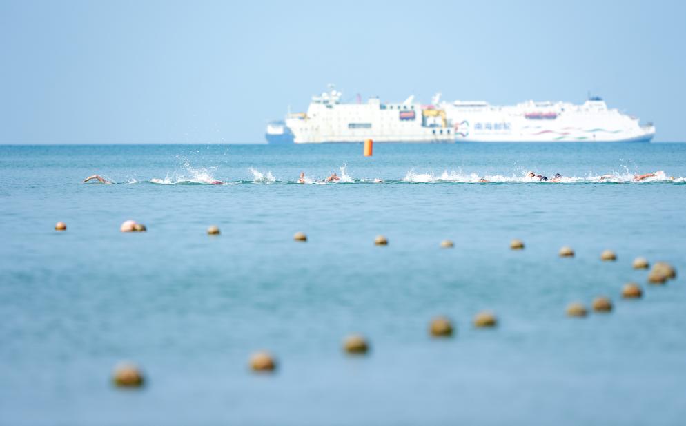 4月26日,参赛选手在第六届亚洲沙滩运动会公开水域游泳男子5公里比赛中。新华社记者 贝赫 摄