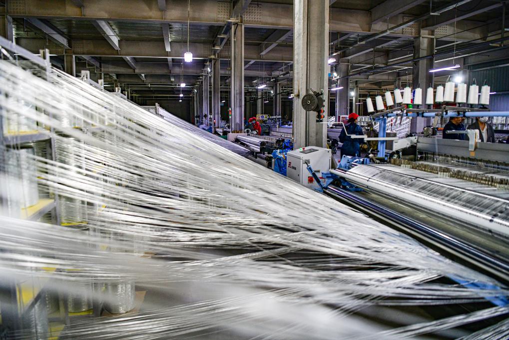 4月19日,工人在内蒙古天皓玻纤有限责任公司的玻璃纤维单丝生产线上作业。新华社发(康文魁 摄)