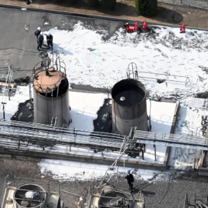 这是4月28日在日本广岛县三次市拍摄的爆炸后的制药厂储罐。新华社/共同社