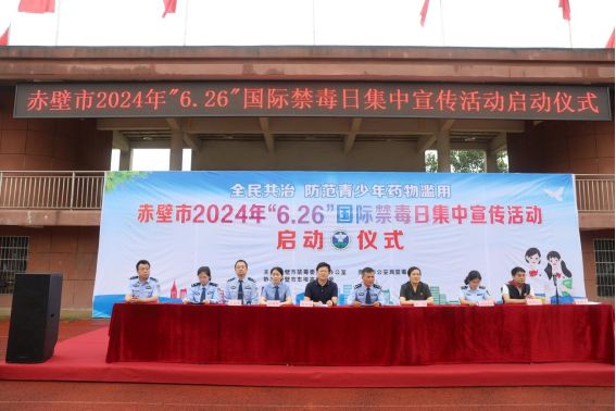 在第37个“6·26”国际禁毒日来临之际,为进一步加强在校学生毒品预防教育工作,筑牢校园毒品防火墙,6月25日,赤壁市公安局禁毒大队联合市法院、市检察院、市市场监管局、市疾控中心在车埠高中举办以“全民共治、防范青少年药物滥用”为主题的禁毒宣传活动,共1800余名师生参加启动仪式。