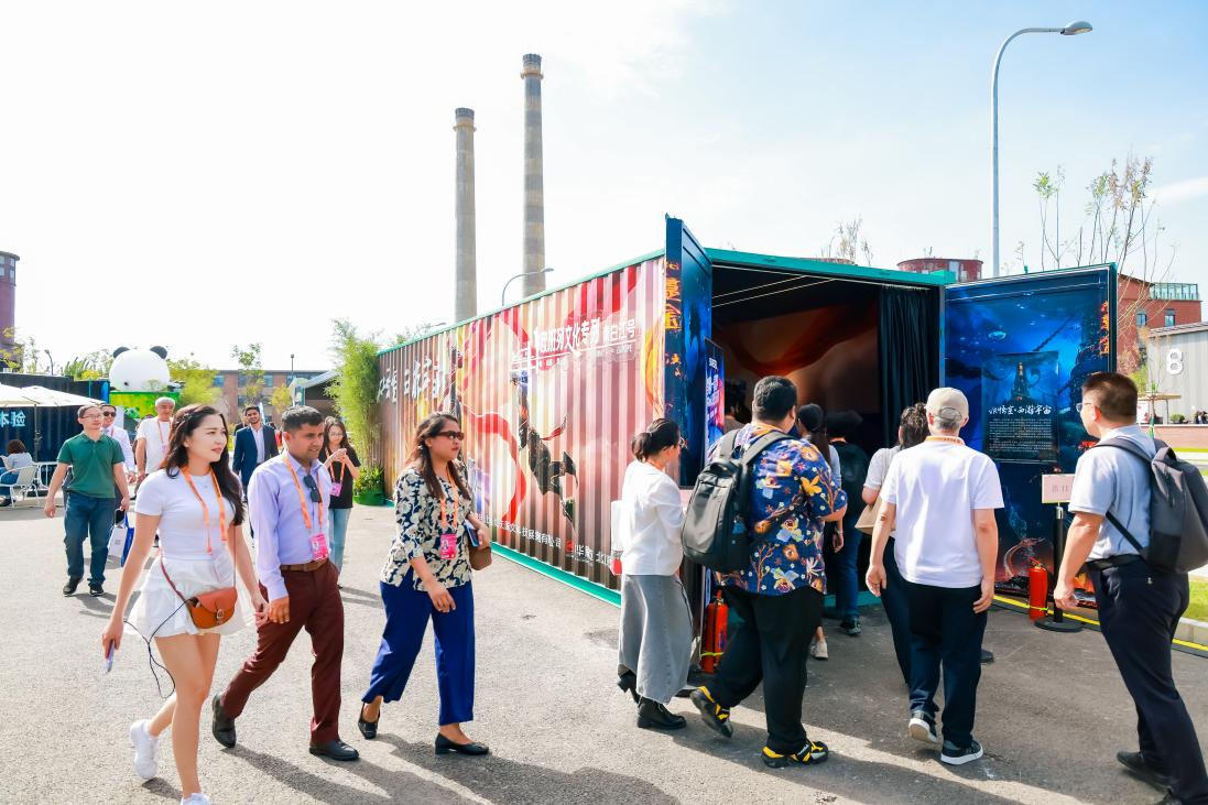 “中欧班列文化专列青白江号”以40尺集装箱改装成火车车厢的形式呈现,占地约1400平方米,将“文化+科技”展示与物流通道深度融合,变“静止”的车厢为“动态”的文化推介载体,通过数字手段展示中华优秀文化场景和青白江区文化产业。
