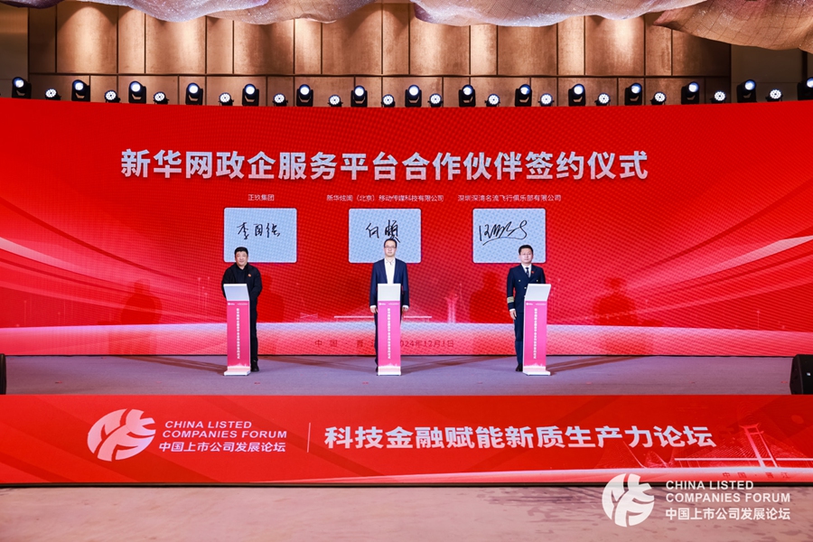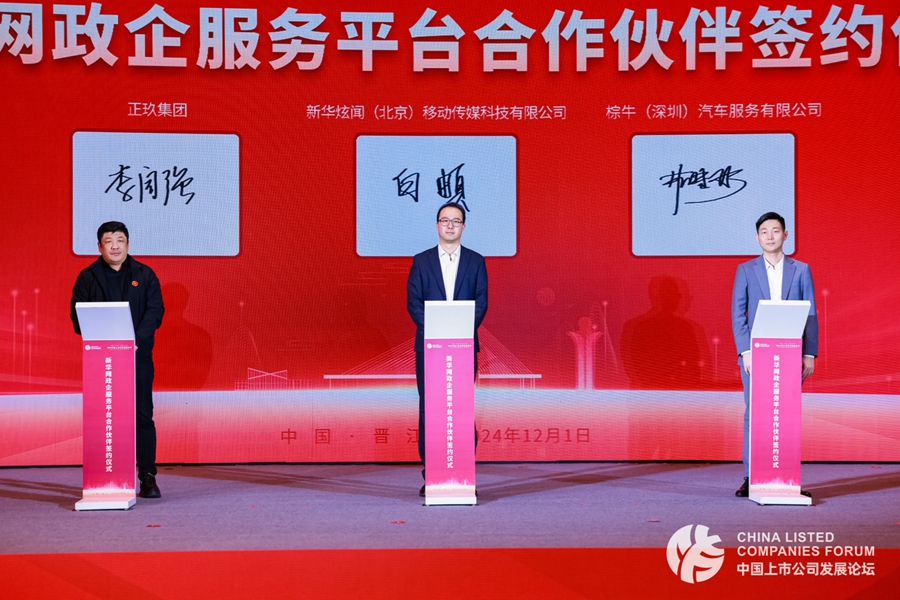 新华网政企服务平台合作签约环节,新华炫闻(北京)移动传媒科技有限公司政企服务事业群总经理白頔、正玖集团董事长李自强与棕牛(深圳)汽车服务有限公司总经理林楚彬代表各自单位签订三方合作。