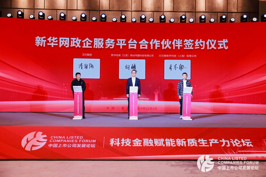 新华网政企服务平台合作签约环节,新华炫闻(北京)移动传媒科技有限公司政企服务事业群总经理白頔、正玖集团董事长李自强与元羽兽数字科技(上海)有限公司总经理辛东航代表各自单位签订三方合作。