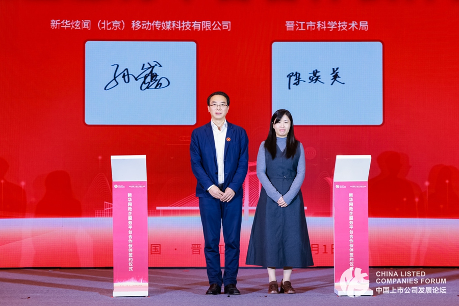 新华网政企服务平台合作伙伴签约环节,新华网首席运营官、新华炫闻(北京)移动传媒科技有限公司董事长孙巍与晋江市科学技术局党组成员、三级主任科员陈英美代表各自单位签约。