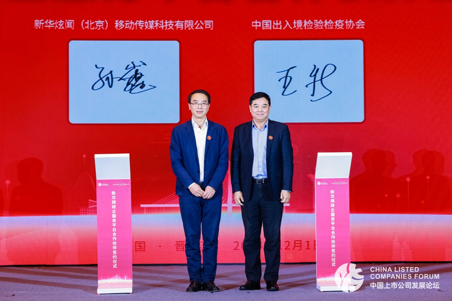 新华网政企服务平台合作伙伴签约环节,新华网首席运营官、新华炫闻(北京)移动传媒科技有限公司董事长孙巍与中国出入境检验检疫协会会长王新代表各自单位签约。