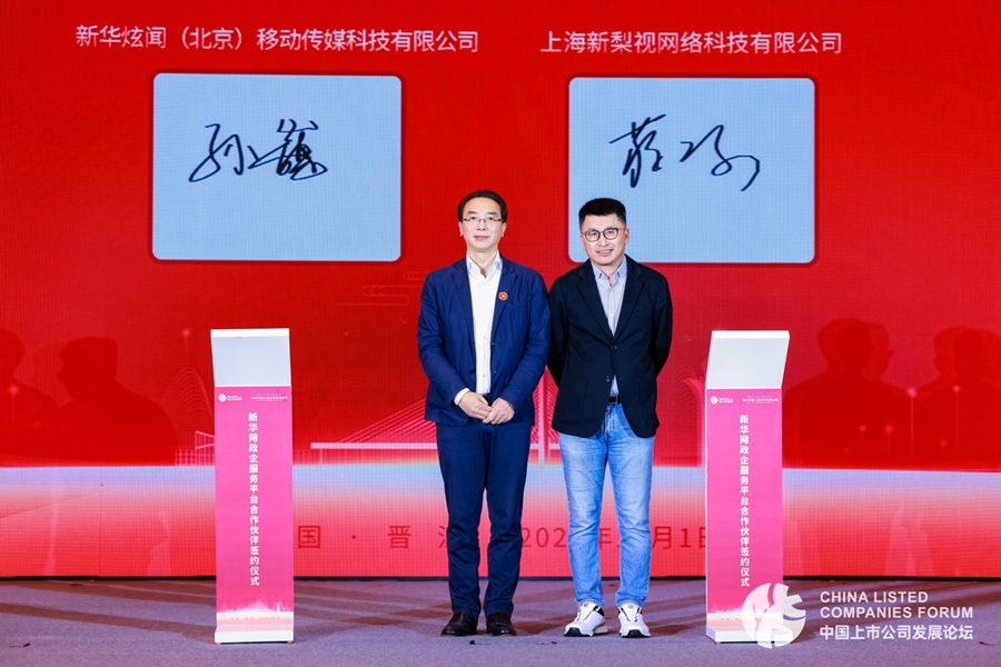 新华网政企服务平台合作签约环节,新华网首席运营官、新华炫闻(北京)移动传媒科技有限公司董事长孙巍与上海新梨视网络科技有限公司执行总裁蒋玉森代表各自单位签约。