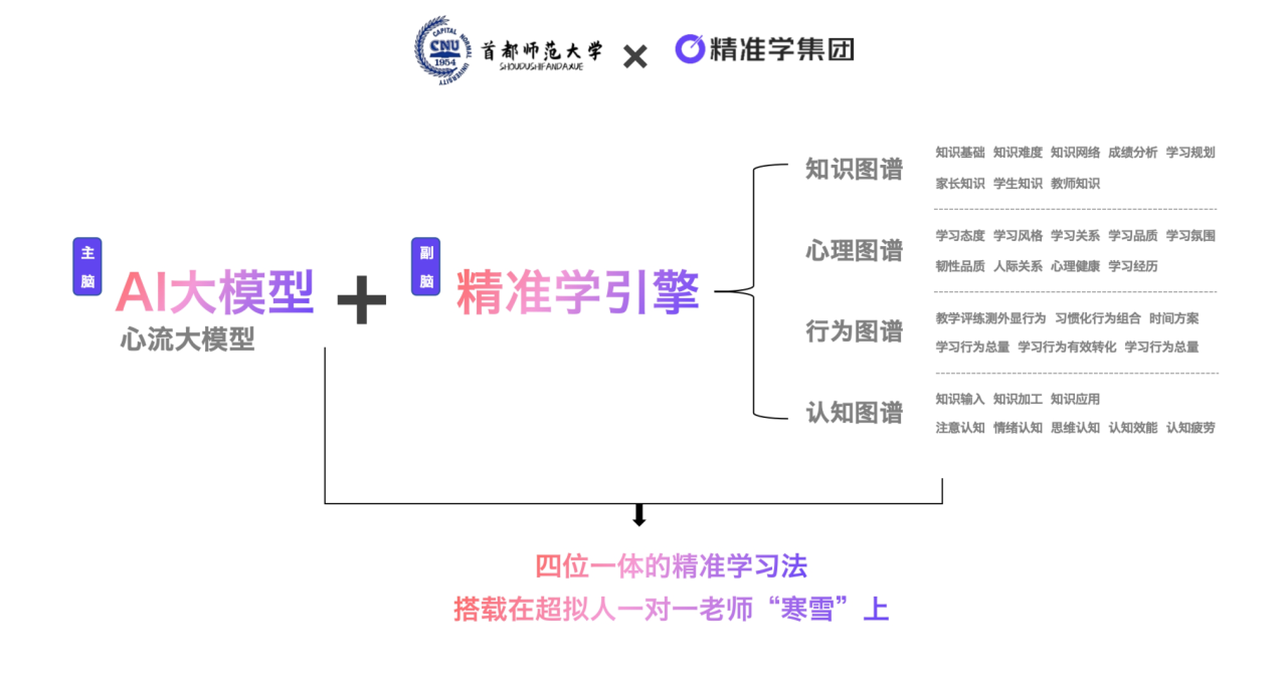 如果说通用AI在讲题时候是一个大模型主脑在计算,“寒雪”在讲题时,相当于有1颗心流大模型(精准学自研的教育垂直大模型)的主脑+1颗四位一体的副脑在同时运算。其副脑分别包含知识图谱、心理图谱、行为图谱和认知图谱。