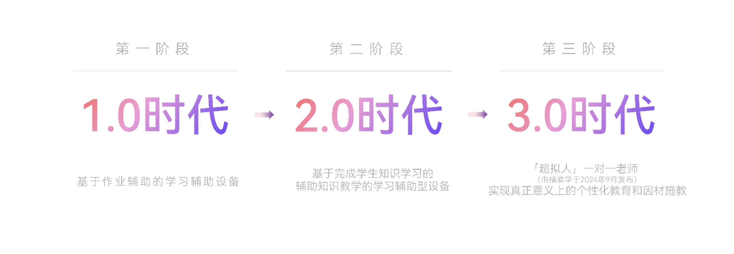 肖晶在采访中提到了学习辅助设备发展的三个阶段。第一阶段是基于作业辅助的学习辅助设备1.0时代,第二阶段是基于完成学生知识学习的学习辅助型设备2.0时代, 而第三阶段,即是以超拟人AI为代表的3.0时代,这一阶段要实现真正意义上的个性化教育,也即因材施教。