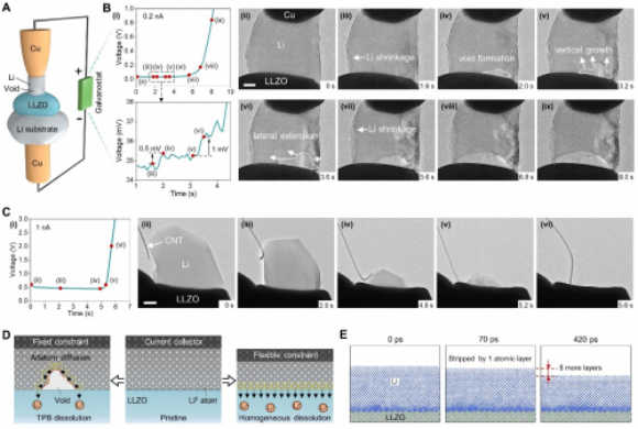 论文通讯作者王鸣生介绍,采用锂金属作为负极的固态电池被视为下一代安全、高比能储能技术的理想选择。固态锂金属电池在正常放电时,锂金属会在其与固态电解质的界面处发生剥离。目前普遍面临的一个问题是锂负极在剥离过程中容易在该界面处产生孔洞,导致电池性能迅速衰减,这也是固态电池有别于液态电池的根本性难题。这些界面孔洞如同电池内部的“隐形杀手”,不仅造成电池内阻激增,还会诱发锂枝晶生长,威胁电池安全。尽管科学界长期关注这一问题,但受限于技术手段,界面孔洞如何产生、演化及其与电化学行为的关联仍不明确。