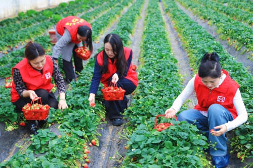 图为“金叶阳光”支队志愿者们在草莓大棚里采摘草莓