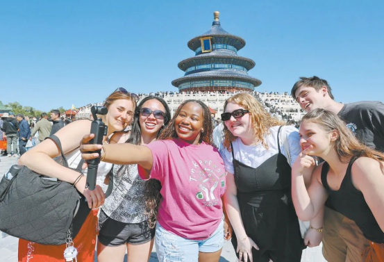 “五一”假期,入境游持续升温,大批外国游客在天坛公园游览。王新摄
