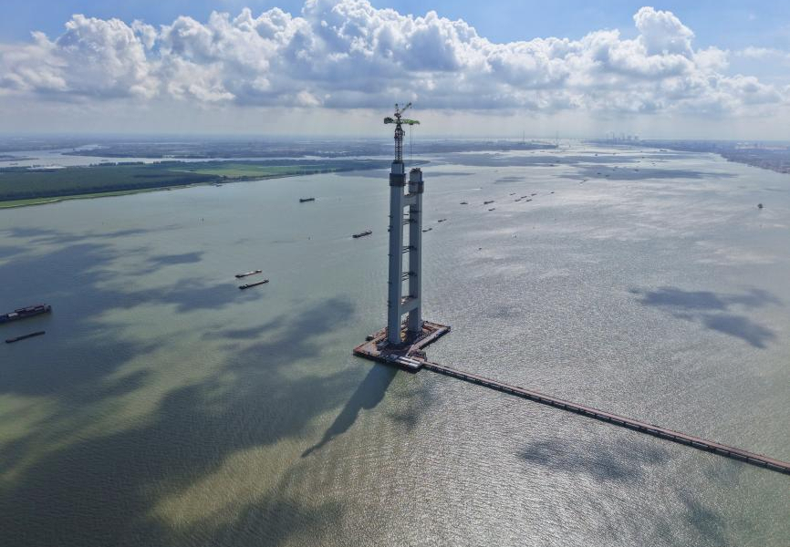 张靖皋长江大桥是国家“十四五”期间重点推动建设的过江通道项目,落实了长三角一体化,贯通苏州张家港市、泰州靖江市和南通如皋市,是江苏省跨江融合发展战略的重大举措。全长约29.85公里。其中,跨江段全长7.859公里,包括两座航道桥,分别为主跨2300米的南航道桥和主跨1208米的北航道桥,是世界最大跨度的悬索桥。2025年5月,大桥南航道桥南主塔中横梁已成功合龙,项目整体建设进展顺利,预计2028年建成。