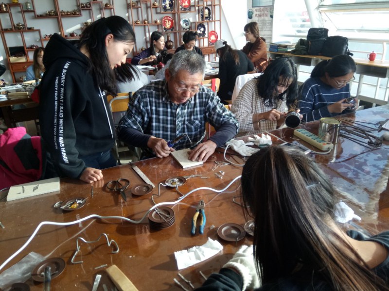 图为谷伟大师向同学传授锡镶技艺