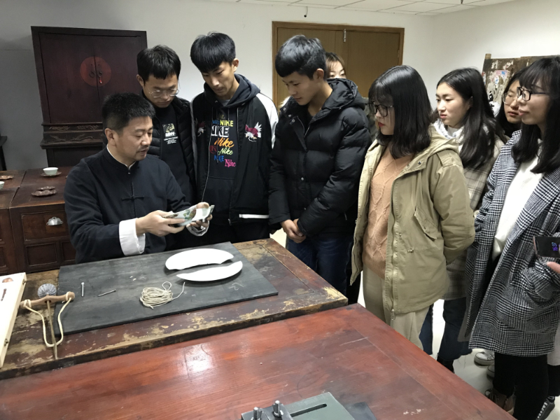 图为耿海胜大师向同学们展示锔瓷技艺