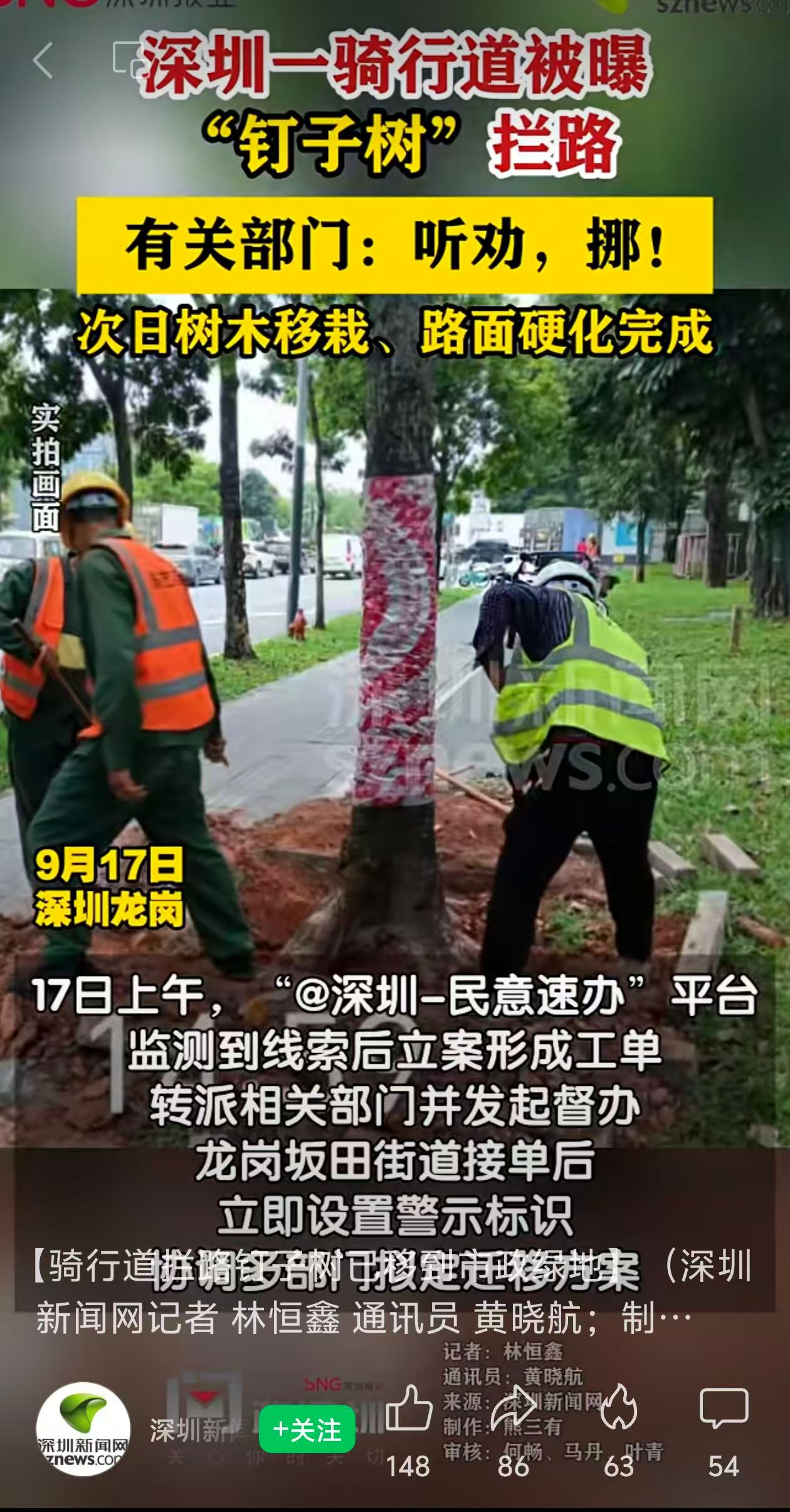 如9月16日,“卷尺哥”拍下拦路“钉子树”的视频,媒体关注报道后,平台第一时间立案转派给相关部门并发起督办。龙岗坂田街道接单后立即设置警示标识,并快速拟定树木迁移方案,协调城管、交管部门联动处置。9月17日下午,树木被移至五和大道市政绿地,随后路面完成硬化,道路恢复通行。从发现相关线索,立案、转派、办理、反馈,整个过程不到24小时,问题得以妥善处理。