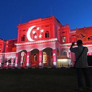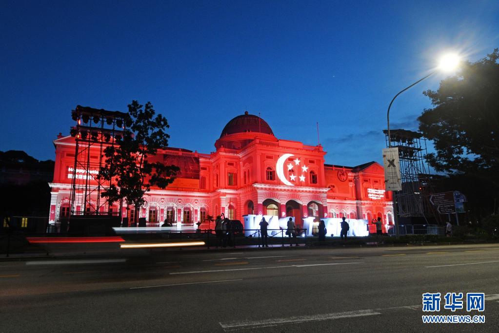这是8月10日拍摄的新加坡国家博物馆庆祝新加坡独立56周年的灯光投影。