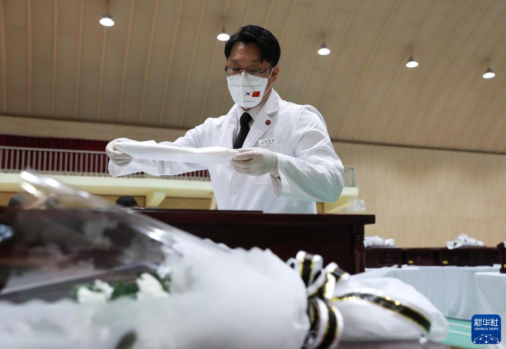 9月1日,在韩国仁川,韩方工作人员将志愿军烈士遗骸入殓。新华社记者 王婧嫱 摄