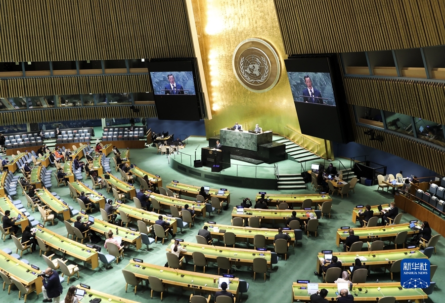 9月27日,在位于纽约的联合国总部,朝鲜常驻联合国代表金星在第76届联合国大会一般性辩论中发言。 朝鲜常驻联合国代表金星27日在纽约第76届联合国大会一般性辩论中发言,谴责美国长期对朝鲜实行敌对政策,敦促美国永久取消在朝鲜半岛及其周边的联合军演和战略武器部署。 新华社记者 王迎 摄