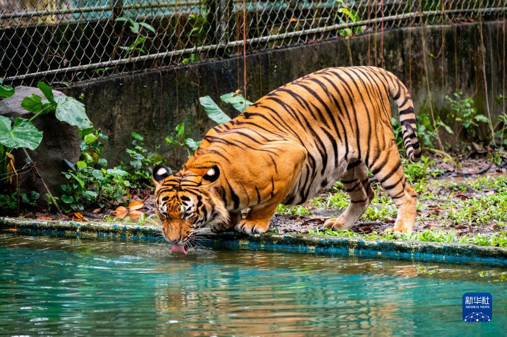 2月27日,在马来西亚吉隆坡附近的国家动物园,马来亚虎“黑霸”在喝水。