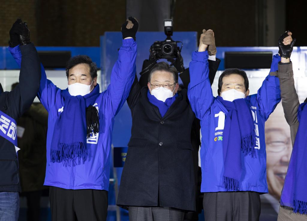 2月15日,候选人李在明(中)在韩国首尔参加竞选活动。(新华社发,李相浩摄)
