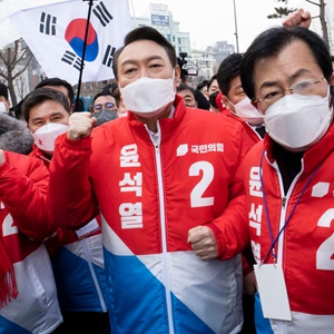 2月15日,候选人尹锡悦(中)在韩国首尔参加竞选活动。(新华社发,李相浩摄)