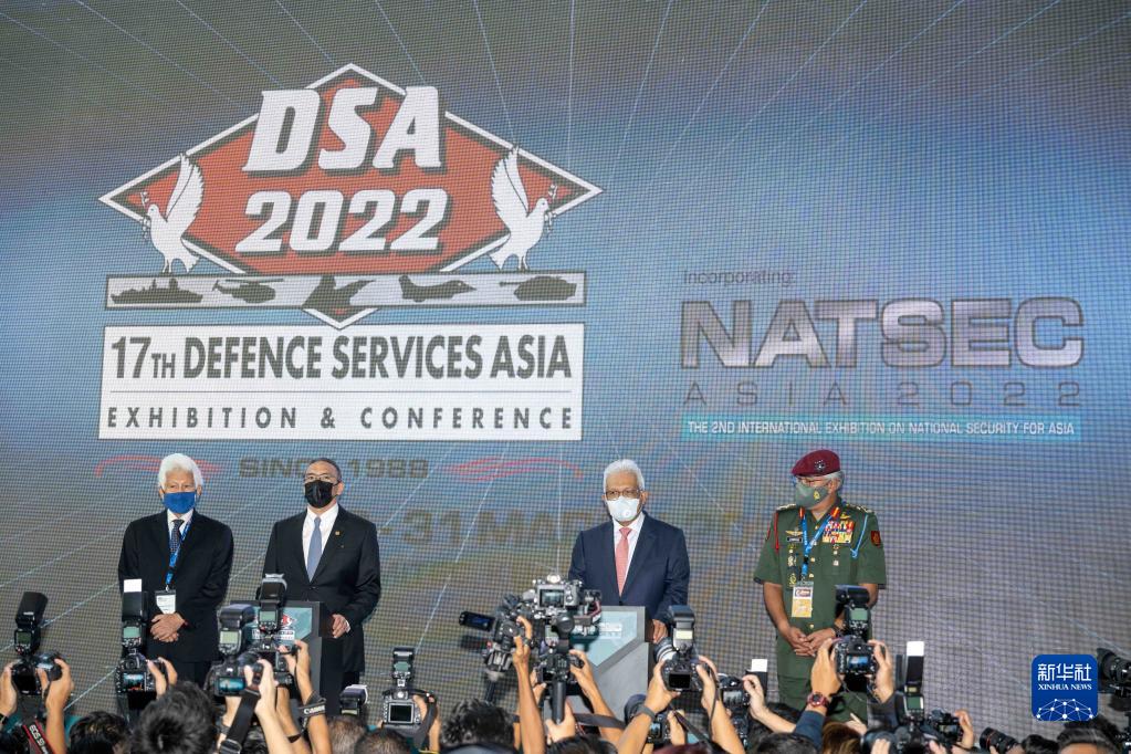 3月28日,在马来西亚吉隆坡举行的第17届马来西亚亚洲防务展上,马来西亚国防部长希沙姆丁(左二)和内政部长哈姆扎(右二)出席开幕式。新华社记者 朱炜 摄