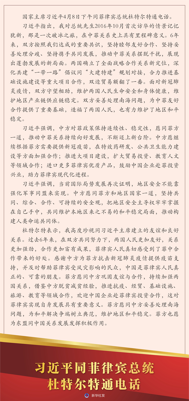 新华社北京4月8日电 国家主席习近平4月8日下午同菲律宾总统杜特尔特通电话。