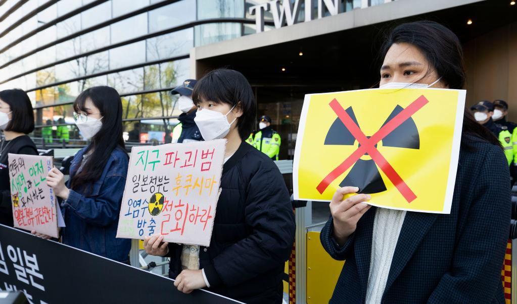 2021年4月14日,韩国民众在首尔的日本驻韩使馆外集会,抗议日本政府决定将福岛核污染水排入大海。(新华社发,徐儒锡摄)