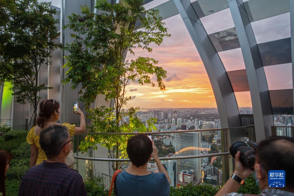 5月10日,人们在新加坡凯源大厦观赏日落。