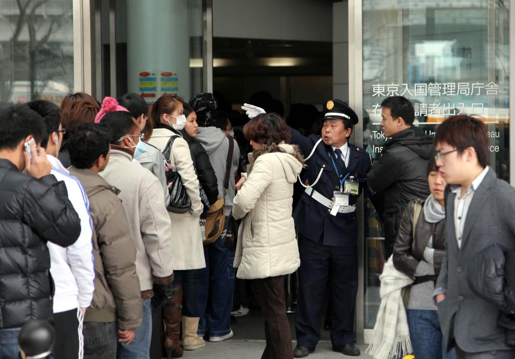 2011年3月16日,一些外国人在日本东京出入境管理局楼前排队办理出入境相关手续。(新华社记者冯武勇摄)