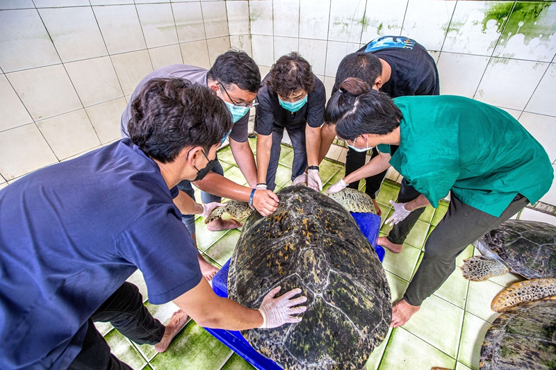 ↑6月21日,在泰国罗勇府蒙奈岛海龟保护中心,南塔日卡博士(中)和同事在为一只海龟体检。