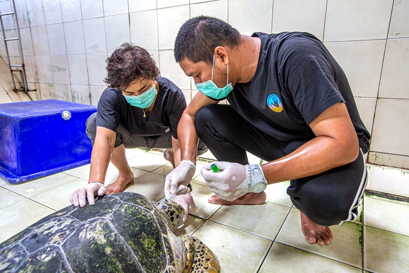 ↑6月21日,在泰国罗勇府蒙奈岛海龟保护中心,南塔日卡博士(左)和同事为一只海龟体检。