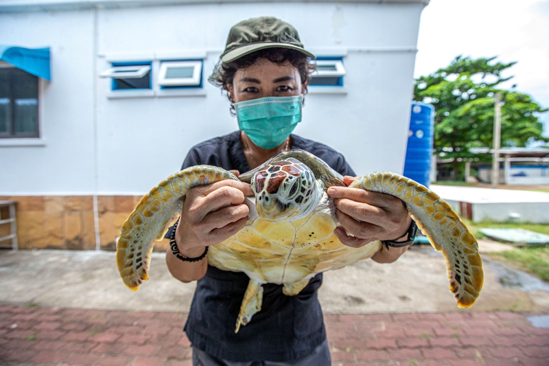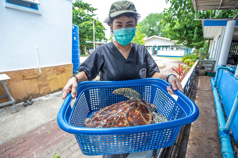 ↑6月21日,在泰国罗勇府蒙奈岛海龟保护中心,南塔日卡博士搬运一只海龟。
