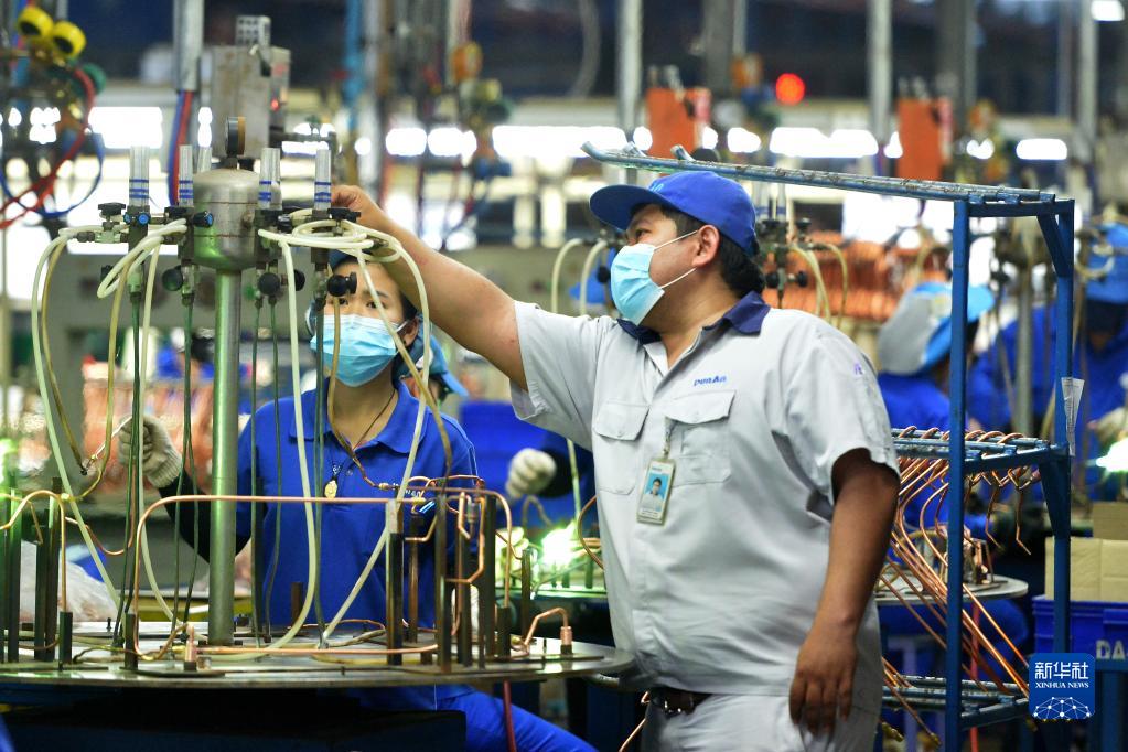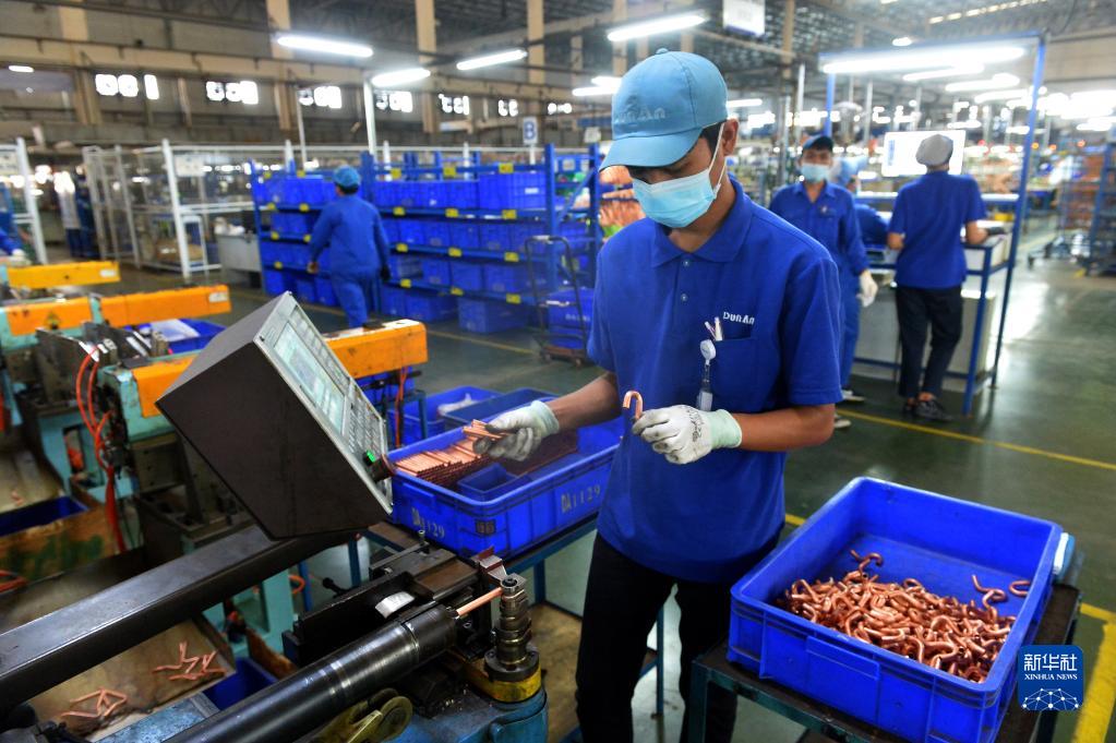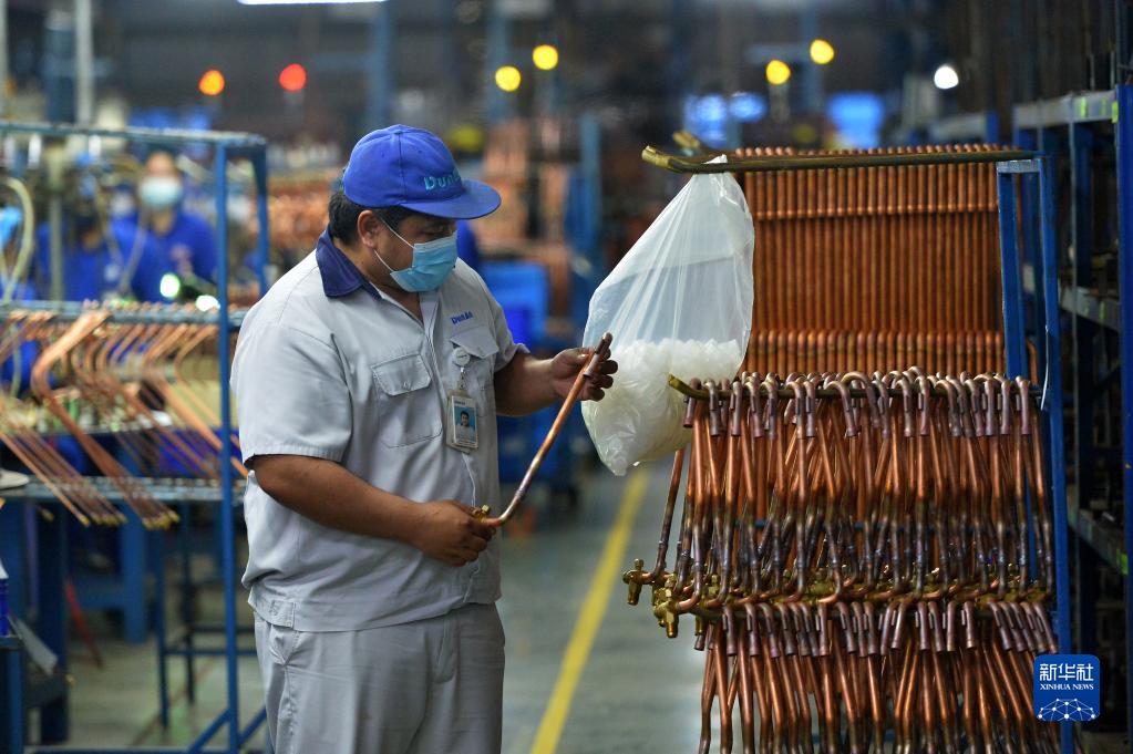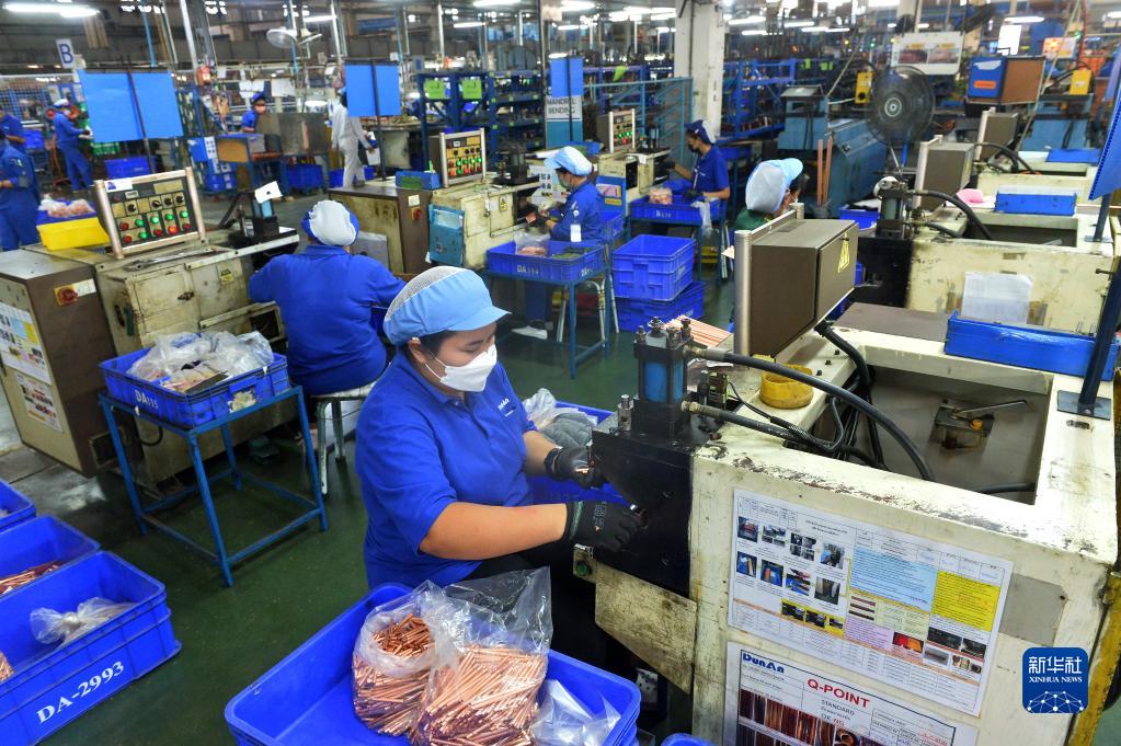 11月8日,在位于泰国罗勇府的泰中罗勇工业园,工人在盾安金属(泰国)有限公司生产线上工作。新华社发(拉亨摄)