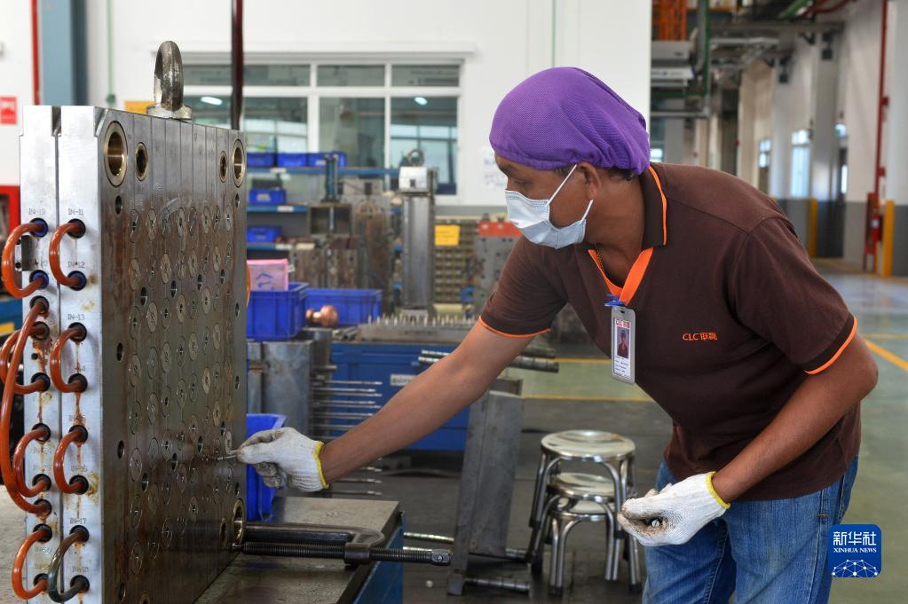 11月8日,在位于泰国罗勇府的泰中罗勇工业园,泰国工人威戚在联昌(泰国)喷雾泵有限公司生产线上工作。威戚说:“在中国企业工作比较稳定,我的生活变得更好了。”新华社发(拉亨摄)