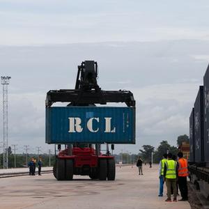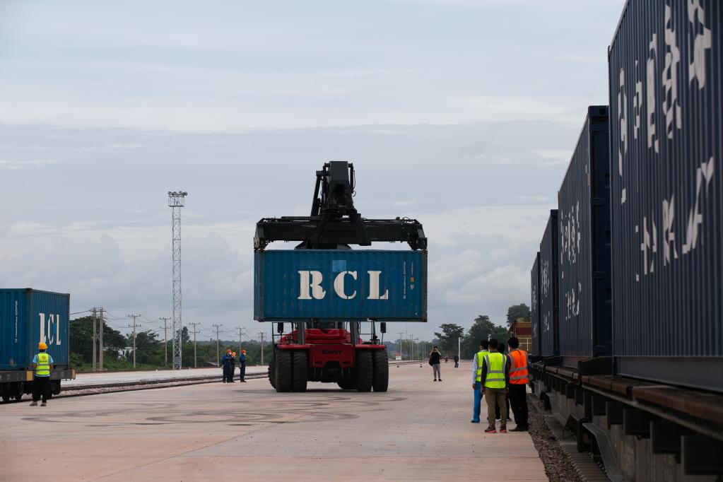 这是2022年7月1日在老挝万象中老铁路万象南站换装场拍摄的进行换装的中泰跨境集装箱。中老铁路万象南站换装场1日正式建成投用,首批跨境集装箱在此完成标准轨与米轨间换装后运往泰国。这标志着中老泰铁路实现互联互通,陆海联运国际物流通道更加便捷通畅。新华社发(凯乔摄)