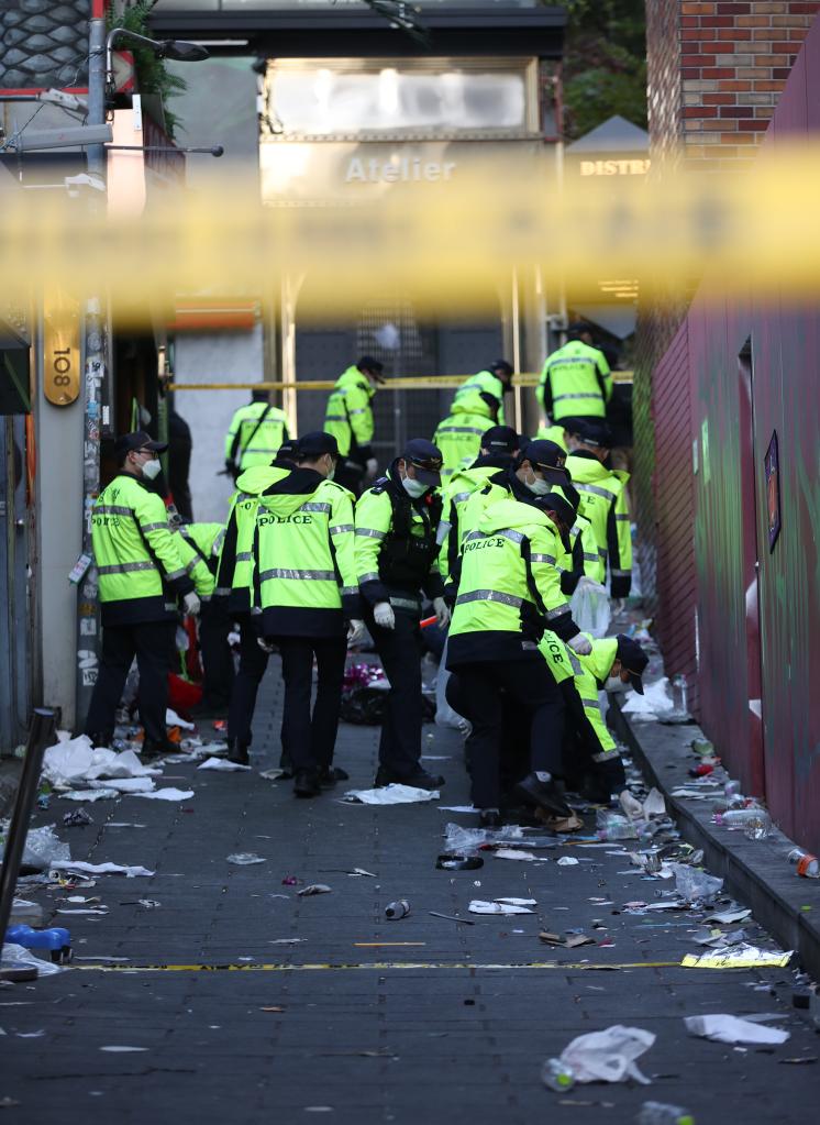 去年10月30日,警察在韩国首尔市龙山区梨泰院洞一带的踩踏事故现场工作。新华社/纽西斯通讯社