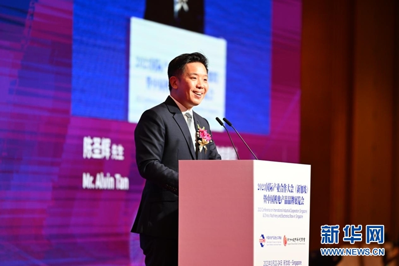 3月22日,2023国际产业合作大会(新加坡)暨中国机电产品品牌展览会在新加坡滨海湾金沙会议展览中心开幕。图为新加坡贸易与工业部政务部长陈圣辉致辞。(新华网 陈冰 摄)