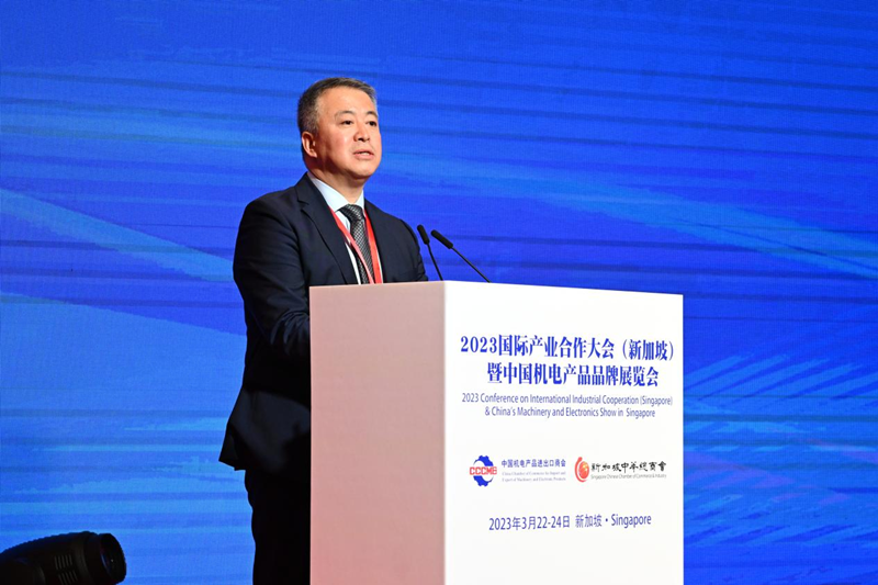 3月22日,2023国际产业合作大会(新加坡)暨中国机电产品品牌展览会在新加坡滨海湾金沙会议展览中心举办高峰论坛。图为中国机械工业工程集团有限公司董事长王博作主题演讲。(陈冰 摄)