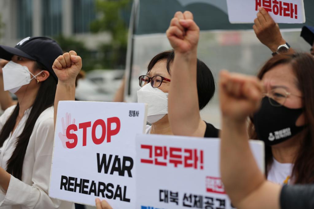 2022年8月22日,集会者手持标语牌在韩国首尔参加集会反对韩美军演。新华社记者王益亮摄
