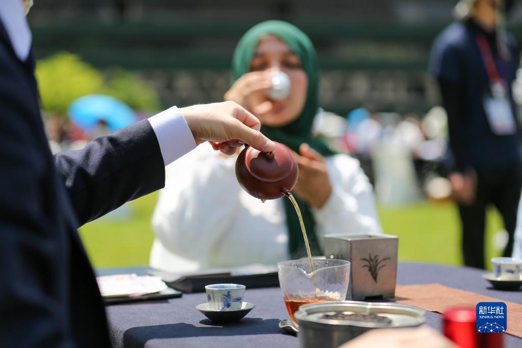 5月19日,游客在韩国首尔广场品尝中国茶。