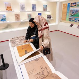 5月26日,观众在马来西亚吉隆坡举行的第40届吉隆坡国际书展上参观“中国历代绘画大系”特展。新华社记者 朱炜 摄