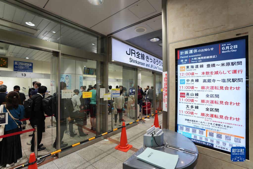6月2日,人们在日本名古屋排队购买车票,屏幕上显示着当日停运列车。