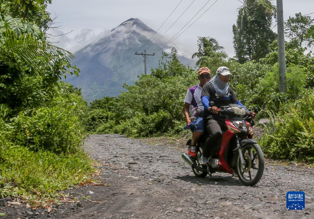 6月12日,居民在菲律宾东北部阿尔拜省的马荣火山附近骑行。